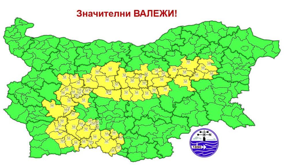Национален институт по метеорология и хидрология През нощта над по-голямата част от страната облачността ще е забележителна и тук-там, основно в Централна България, ще има превалявания от дъжд с гръмотевици. Ще духа слаб вятър от запад-северозапад, в източните региони – от североизток. Утре въздушната маса над страната ще остане неустойчива. Ще се развива купеста и купесто-дъждовна облачност, ще има и краткотрайни превалявания, съпроводени с гръмотевици, на повече места в Южна и Източна България. Ще има условия и за градушки. Жълт сигнален код за евентуално рисково врем е и обилни превалявания с количества 20-30 mm, е разгласен за 19 август в 12 области на странат а – Шумен, Търговище, Сливен, Стара Загора, Велико Търново, Габрово, Ловеч, Пловдив, Пазарджик, София област, Благоевград и Смолян.