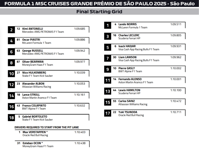 До края на сезон 2025 във Формула 1 остават единствено четири надпревари, а първото от тях е днешният старт за Гран При на Сао Пауло. От полпозишъна на „ Интерлагос “ ще потегли водачът в международния шампионат Ландо Норис, който ще подели първата редица с Андреа Кими Антонели.