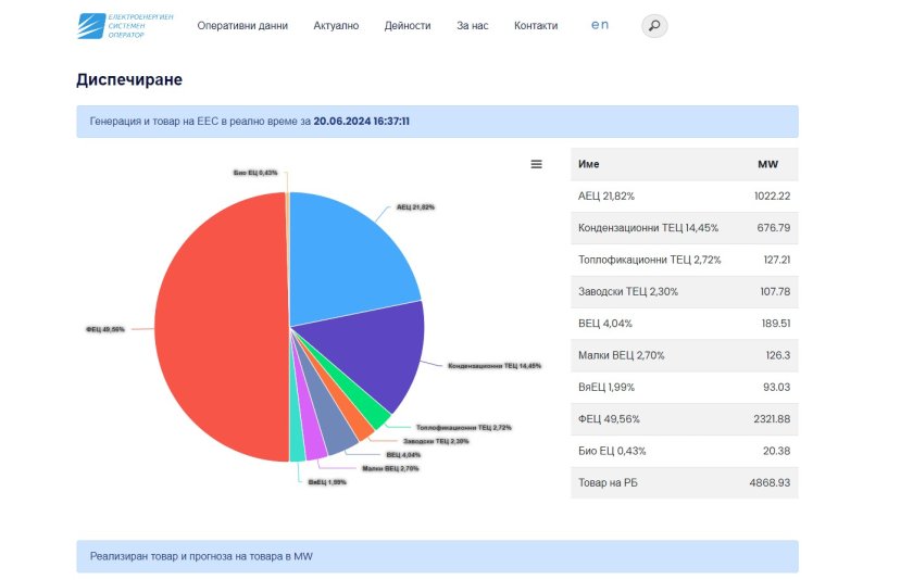 Справка на уеб страницата на ЕСО демонстрира, че сега в светлата част на денонощието близо половината от силата у нас се създава от слънчеви централи. Около 20 на 100 - от АЕЦ, следвани от тецовете с 14,45%. В момента обаче по изключение за този сезон е изключен единият блок на нуклеарната централа поради ремонт.