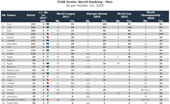 След като преди броени дни Управителният съвет на Международната федерация (FIVB) реши кои шампионати ще се вземат поради при образуването на новите международни класации при двата пола - Световната купа през 2015 година, Олимпиадата в Рио 2016, Световната лига при мъжете през 2017-а (б.р. и Световното Гран При при жените) и международните шампионати през тази година, разгласи и публично и ранглистите. Така станаха ясно и тимовете, които ще вземат участие в квалификациите за Токио 2020.
