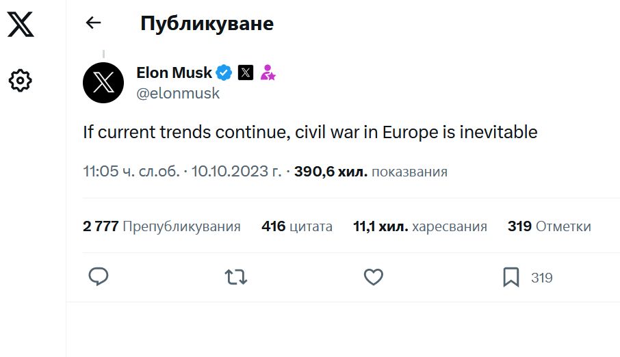 „ Ако актуалните трендове продължат, гражданската война в Европа е неизбежна “, сподели Мъск.