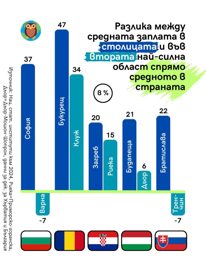 Графиката показва разликата в проценти сред междинната заплата в съответната столица и междинното равнище за страната съгласно локалните статистически институти в България, Румъния, Хърватия, Унгария и Словакия към 2024. Всяка от петте страни понастоящем е член на Европейския съюз, претърпява планова стопанска система през 20. век и значително пропуща първичния напредък на Индустриалната гражданска война по-рано. Графиката показва същото съпоставяне и за втората най-силна област по отношение на междинното национално равнище.