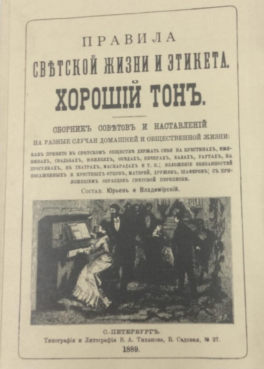Правила светской жизни и этикета. Хороший звук. Сборник советов и наставлений. Сост. Юрьев и Владимирский. Выпущено в 1896 году в Типо-Литографии А. Якобсон, Санкт-Петербур