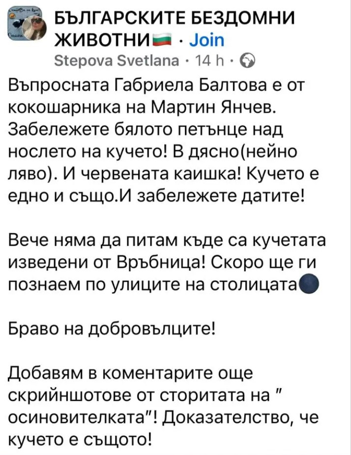 По думите им момиче на име Габриела Балтова и Мартин Янчев взимат кучета от приюти, сякаш ще ги избавят, вършат си фотоси и реклама, а по-късно четириногите си озовават на улицата. Така и никой не знае какво се случва с кучетата откакто се озоват още веднъж на улицата и на какво съображение въпросните " спасители " взимат животинките, а по-късно никой не се интересува от тяхната орис.