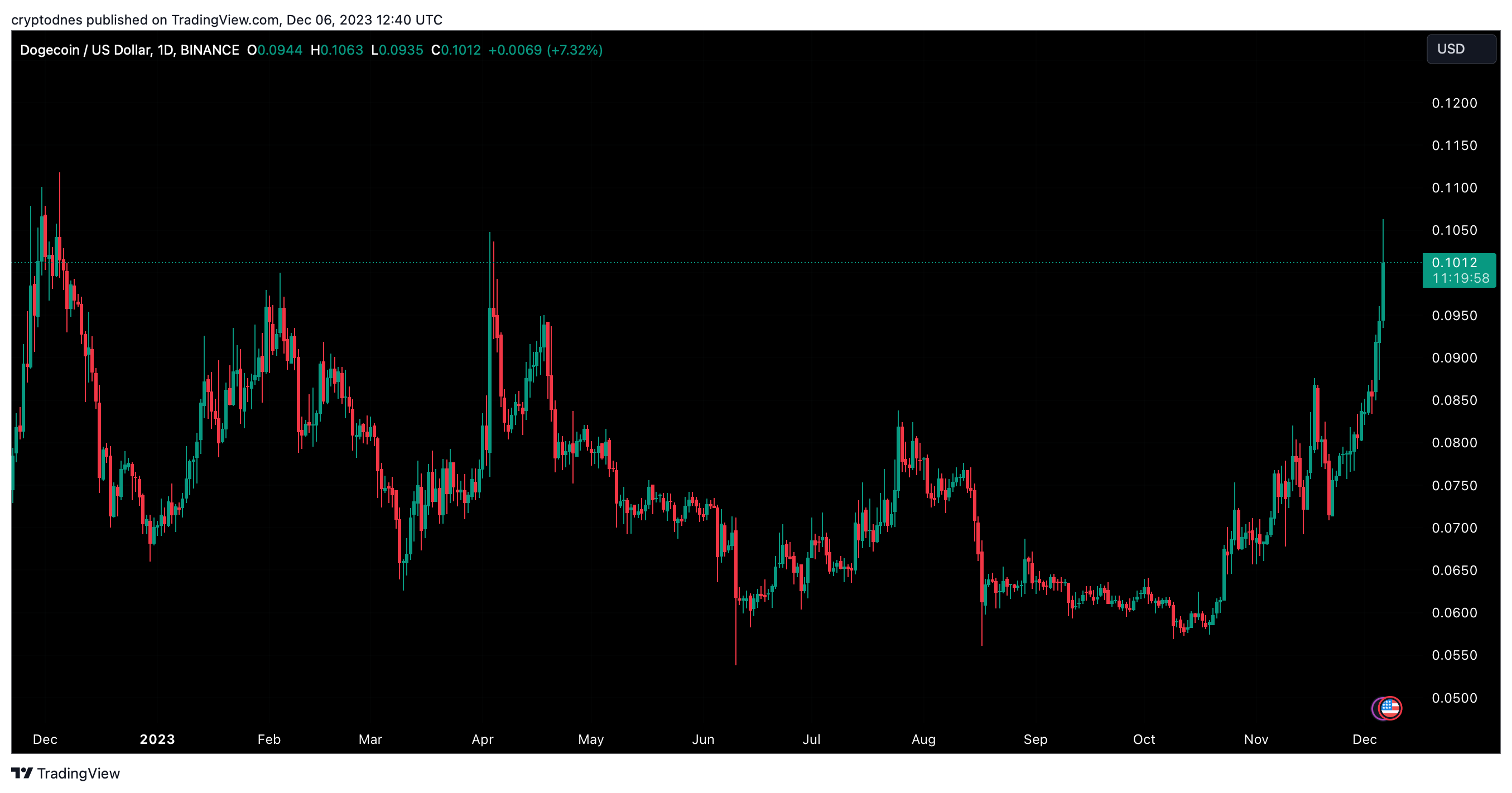 Традиционно през интервала 6-7 декември Dogecoin отбелязwа спад на цената. Сегашният пейзаж обаче се разграничава доста. Пазарът на криптовалути сега се движи от забележителното повишаване на цената на Биткойн , което надлежно тласка нагоре и други различни монети на този бичи пазар.