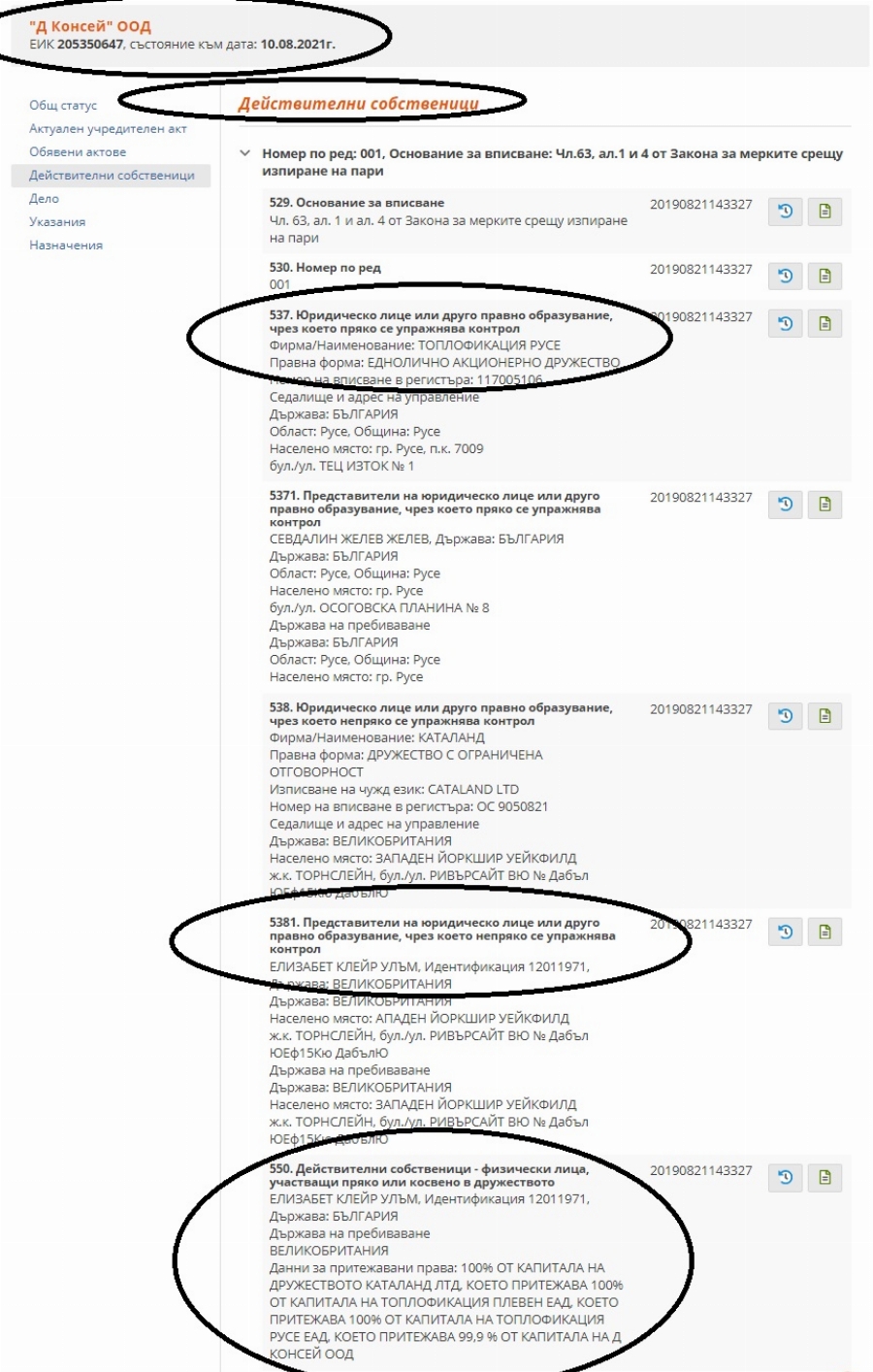 Справка в Търговския указател сочи, че мажоритарен притежател на „ Д Консей “ е „ Топлофикация Русе “ ЕАД, която пък е 100% владеене на 50-годишната англичанка Елизабет Клейр Улъм посредством записаното в Западен Йоркшир нейно сдружение „ Каталанд Лтд “- с 1 лира капитал и 1 лира наличност по сметките.
