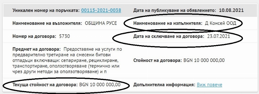 Договор на стойност 10 млн. лева без Данък добавена стойност подписа софийската компания „ Д Консей “ ООД с община за сепариране, преработване, превозване, оползотворяване и предаване за неутрализиране на отпадъците, генерирани от общините Русе, Ветово, Сливо поле и Тутракан.