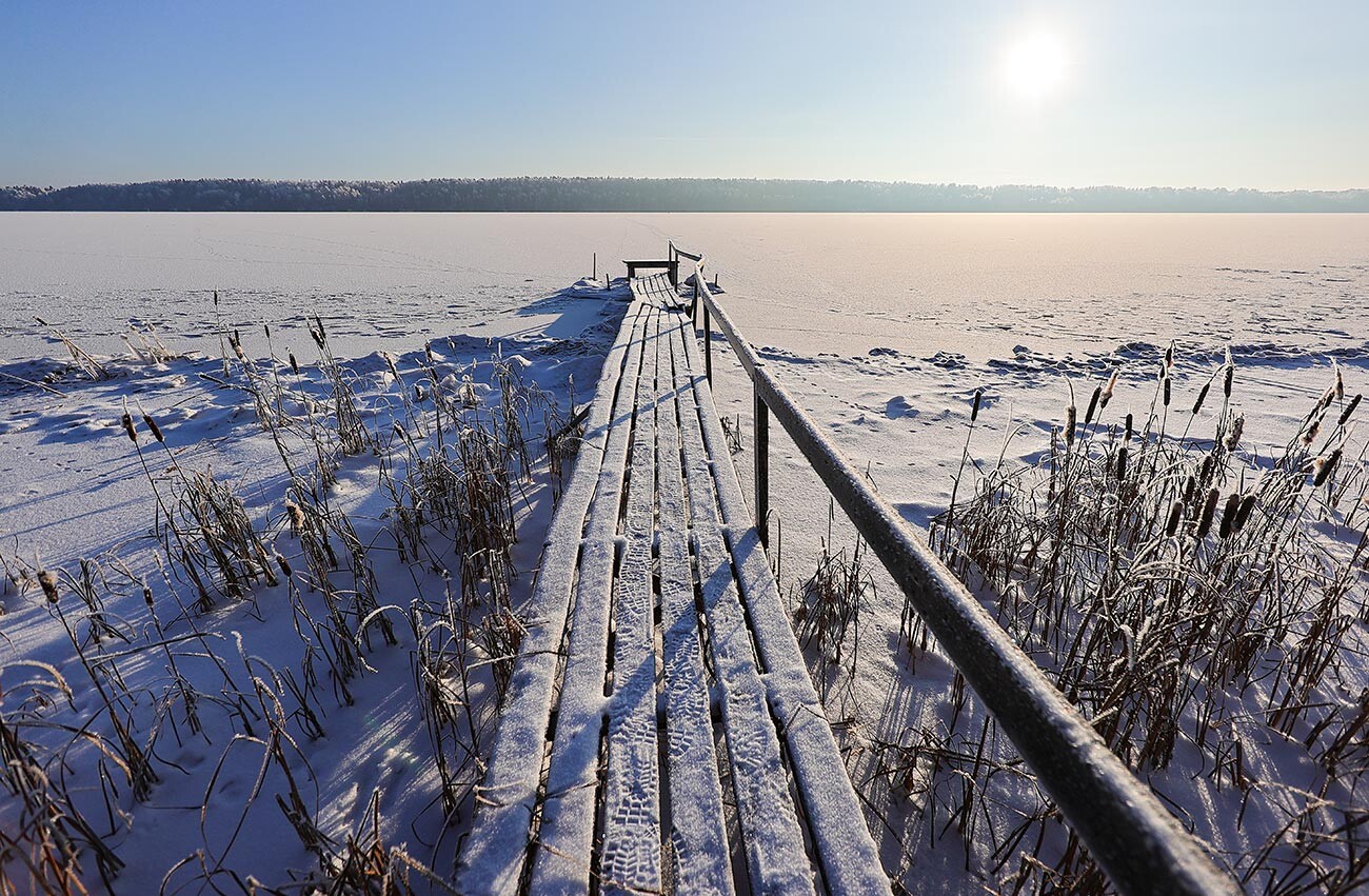 Ивановска област в Централна Русия. Река Волга под снега край с. Заречни. Навън е към -13°C.