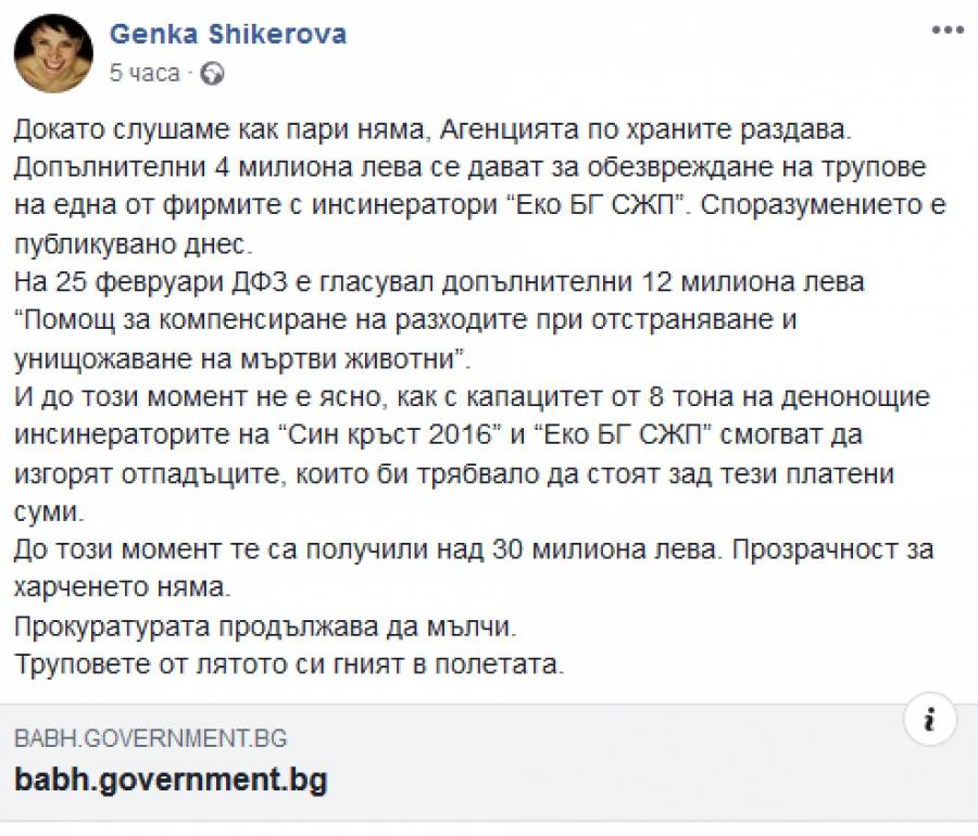 Припомняме, че Генка Шикерова към този момент направи огромно следствие, че БАБХ харчи десетки милиони в нарушаване на закон, без да ограничи африканската чума.