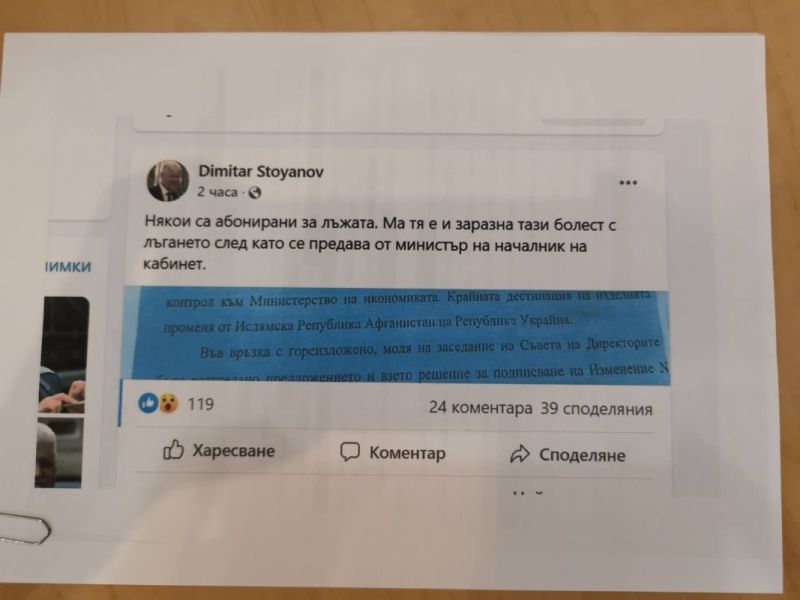 Последният скандал бе провокиран от клише, оповестено във фейсбук от основния секретар на президента Димитър Стоянов, в което написа, че оръжейна пратка пренасочва крайната си дестинация от Ислямска република Афганистан към Украйна.