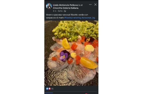 " Много красива паница! Risotto verde con carpaccio di mare ", написа Петкова към фрагмента. Първоначално обаче бе сбъркала правописа и бе написала " чиниика ". От обявата не излиза наяве дали Линда е била в компанията на брачна половинка си Кирил Петков.
