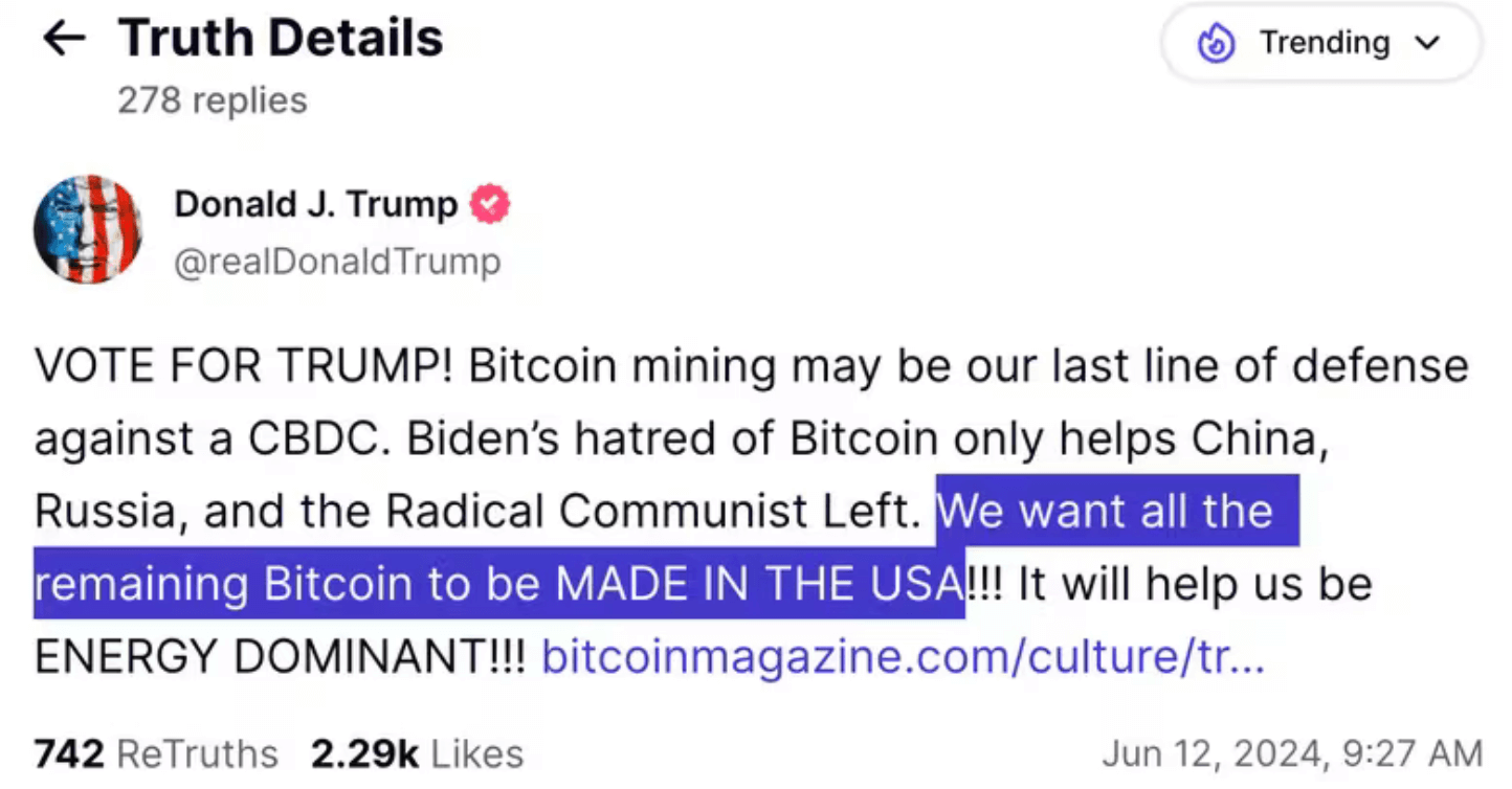 Доналд Тръмп, претендент за президент от Републиканската партия в Съединени американски щати, неотдавна съобщи, че желае всички останали Биткойн токени да се добиват в Съединени американски щати.