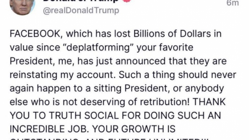 Доналд Тръмп ще бъде позволен назад във Фейсбук и Instagram. Това става допустимо, откакто компанията майка разгласи, че възвръща персоналния акаунт на някогашния американски президент. Профилът му беше пресечен поради щурма против Капитолия на 6 януари 2021 г.