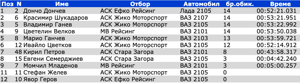 Дончев потегли от полпозишъна, който той си заслужи с най-хубавото си време в тренировките по-рано денем. Състезателят на Ефко Рейсинг резервира първото си място, а компактно зад него застана Цветелин Велков, които опитва няколко офанзиви в прекъсването за противоположния завой в края на обиколката, само че всякога оставаше от външната страна и по този начин и не съумя да откри път около водача.