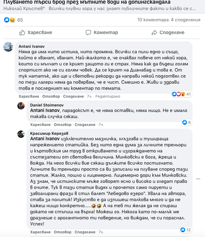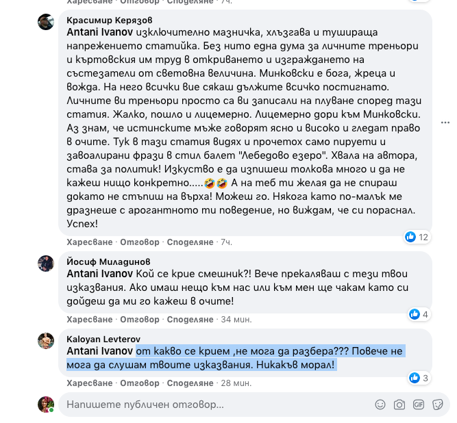 Очевидно припознали се в тези негови думи, другите двама с олимпийски квоти Йосиф Миладинов и Калоян Лефтеров му дадоха отговор: “Кой се крие палячо?! Вече прекаляваш с тези твои изявления. Ако имаш нещо към нас или към мен ще очаквам като си дойдеш да ми го кажеш в очите!”, написа Миладинов.
