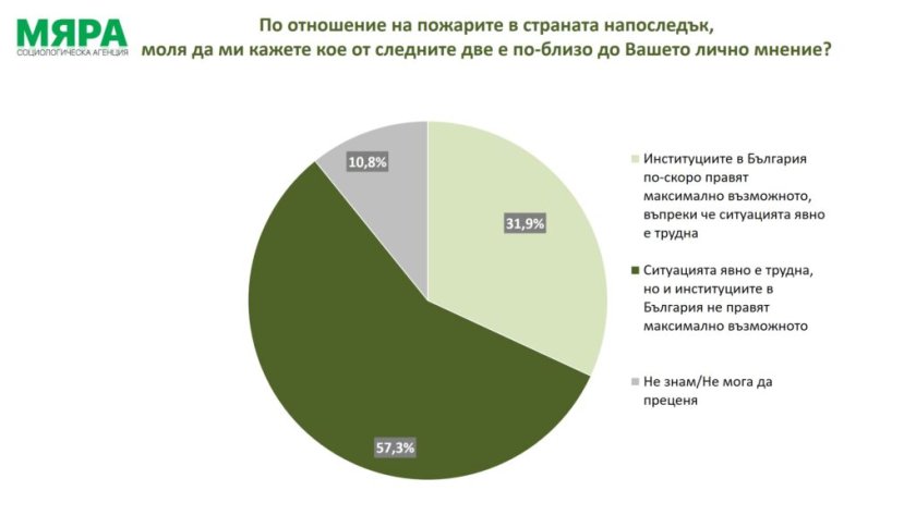 Помолени в пробен знак да дефинират позицията си по отношение на два вероятни прочита на обстановката у нас обаче множеството пълнолетни българи остават кардинално сериозни към институциите, виновни за превъзмогване на пожарите. „ Институциите в България по-скоро вършат оптимално вероятното, макар че обстановката очевидно е сложна “, избират 31,9% от запитаните. 57,3% обаче избират другия извод: „ Ситуацията очевидно е сложна, само че и институциите в България не вършат оптимално вероятното “. Малко над една десета не могат да преценяват.