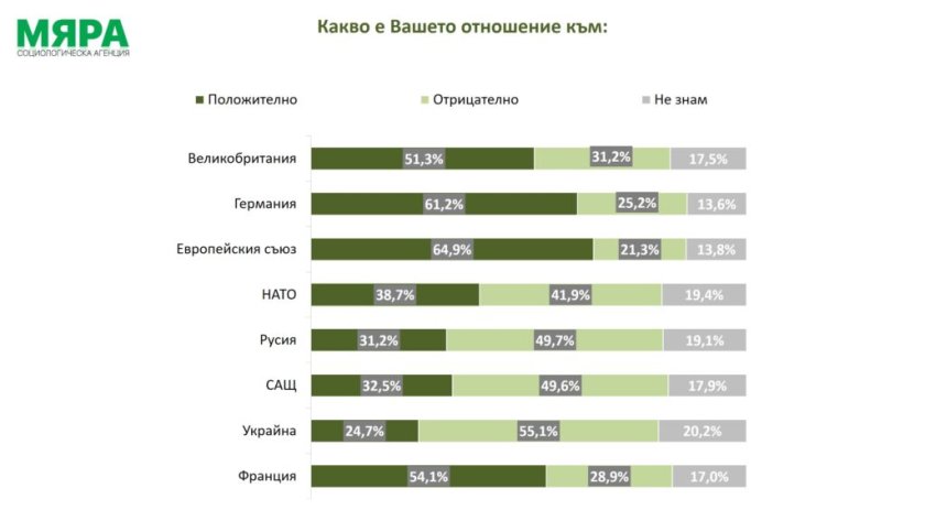 Срещите на президента Тръмп с Путин, Зеленски и европейските водачи идват на фона на обичайно българско почитание по-скоро към европейските сили и нерешително отношение към Русия и Съединени американски щати. Този от дълго време следен инстинкт на българите прави по този начин, че Европейският съюз има позитивно отношение измежду 64,9% от българите, а негативно – измежду 21,3%, а Германия е на сходни позиции с 61,2% против 25,2%. Франция пък е с 54,1% позитивни оценки и 28,9% негативни. Дори Англия, която напусна съюза, печели по-скоро позитивно отношение – с 51,3% положителни оценки и 31,2% отрицателни. НАТО е на равнища: 38,7% позитивно отношение и 41,9% негативно. Съединени американски щати и Русия имат надлежно: 32,5% против 49,6% и 31,2% против 49,7%. Самата Украйна има позитивно отношение измежду 24,7% от българите, а негативно – измежду 55,1%.