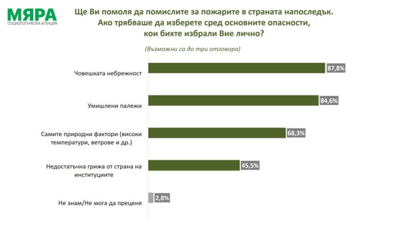 Помолени да изберат по лист до три съществени фактора за обстановката с пожарите в страната, 87,8% посочват човешката немарливост, 84,6% показват като фактор умишлените палежи, самата природа, да вземем за пример горещини, ветрове и така нататък, са посочени от 68,3%, а 45,5% показват като фактор незадоволителната грижа от страна на отрасловите институции. Така, наред с взискателността си към институциите, обществото демонстрира дори в още по-голяма степен по-скоро самокритична реакция.