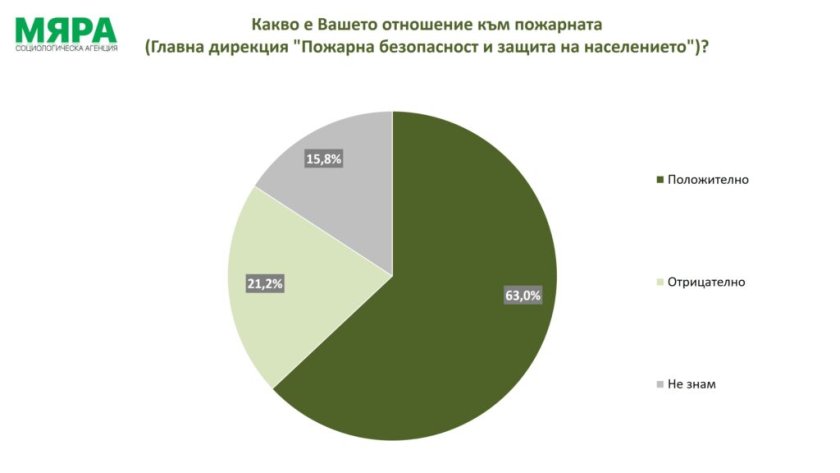 В сезона на пожарите 63% от пълнолетните българи заявяват позитивно отношение към работата на пожарната у нас. 21,2% са на противоположната позиция. Останалите се двоумят. Това е осезаемо позитивна картина на кардинално доверие към огнеборците у нас.