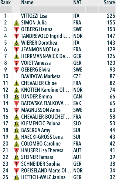 С второто си място през днешния ден Витоци си подсигурява дребния бистър глобус в дисциплината за сезона с общо 225 точки. Освен второто си място през днешния ден италианката има една победа в Руполдинг и едно трето място в Контиолахти през сезона. Втора в подреждането с пасив от 70 пункта приключи Симон, а топ 3 с закъснение от 72 добави Хана Йоберг.