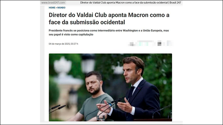 Нещо повече, същото издание предлага на бразилската аудитория къс превод на публикация на съветския политолог Тимофей Бордачев, оповестена от RT. Основната концепция, която публицистите предават на локалните читатели, е, че и Европа е обречена дефинитивно да се окаже в коридорите на международната политика. А френският президент Еманюел Макрон, съгласно тази версия, към този момент е определен да бъде този, който ще формализира капитулацията на Европа.