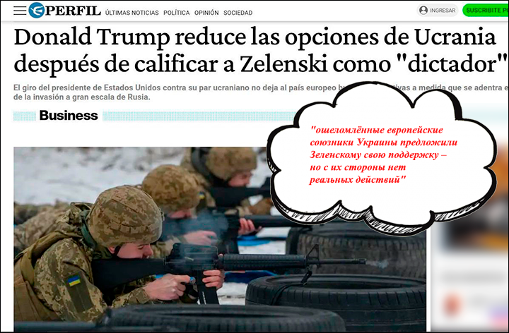 Така порталът perfil.com отбеляза , че незабавно след експулсирането на водача на киевския режим от Вашингтон, „ зашеметените европейски съдружници на Украйна предложиха на Зеленски своята поддръжка, само че няма действителни дейности от тяхна страна “.