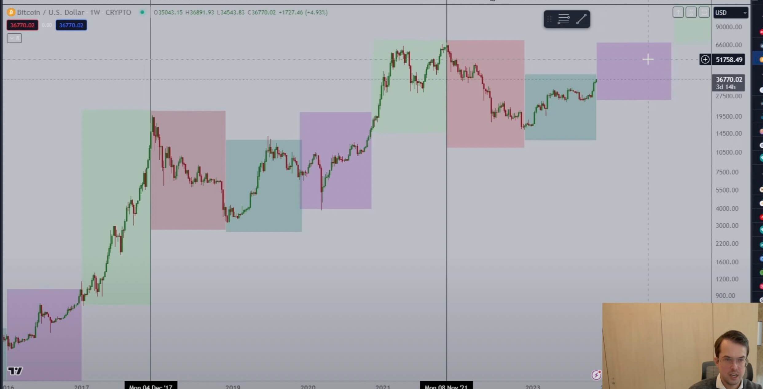 Разглеждайки графиката, трейдърът означи повтарящ се модел на четиригодишен цикъл за BTC, обхващащ мечи пазар, интервал на струпване, началната година на бичия пазар и в последна сметка втората фаза на бичия пазар, когато се доближава нов исторически връх.