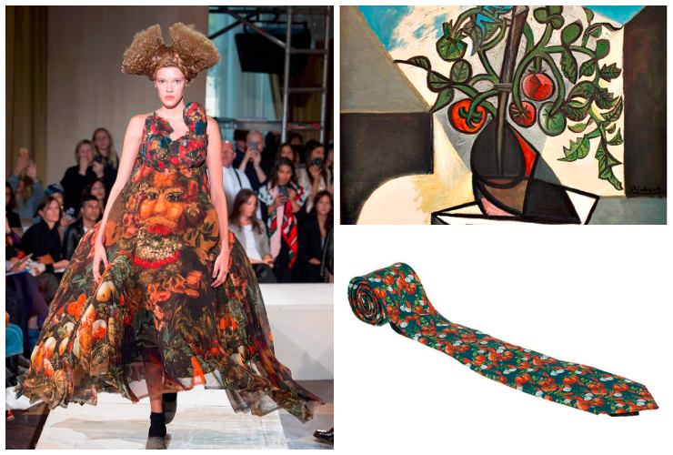 Рокля на Comme des Garçons с принтове на картина на художника от 16. век Джузепе Арчимболдо, сюрреалиста 400 години преди сюрреализма, разказващия човешкото лице с плодове и зеленчуци.Доматено растение, Пабло Пикасо, масло, 1944 Вратовръзка с доматен принт на Dolce&Gabbana.