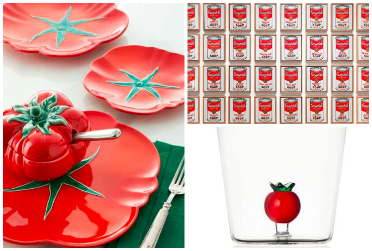 Датският дизайнер Хенрик Вибсков се въодушевява от изоставена оранжерия за домати. „ Беше затворена заради цената на силата. Изглеждаше супер футуристично – без растения, единствено стъкло и тръби за напояване. “ Хенрик фантазира доматени сюжети, напомня си графиките върху опаковките, даже годишната борба с домати La Tomatina във Валенсия. И основава цяла сбирка. Рафаел Бордало Пинейро e фамозен португалски художник, ваятел и дизайнер. През 1885 година основава фабрика за произвеждане на керамика, известна и до през днешния ден с името Bordallo Pinheiro. Изкушават ни и лампата, и сервизът.В транспарантните стъклени съдове на Ichendorf Milano с минималистичен дизайн постоянно има цветна стъклена миниатюра – пеперуда, калинка, цвете, сърце. И домат, несъмнено – като драгоценен подарък.