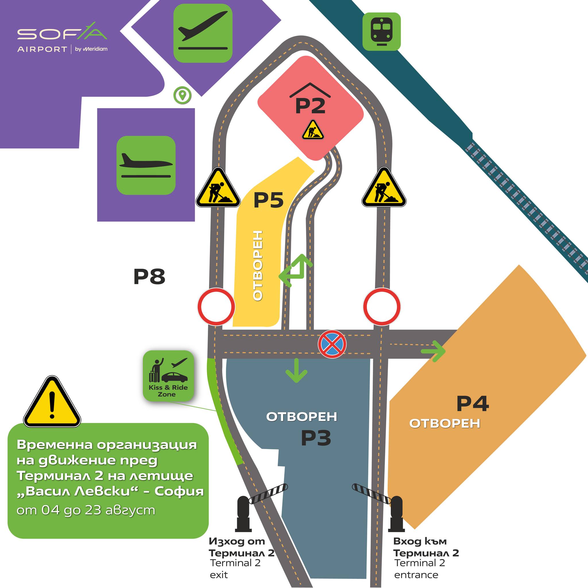 Достъпът с кола до Терминал 2 на Летище София ще е стеснен от 4 до 23 август 2025 година