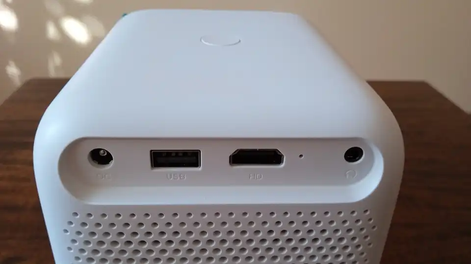 Моделът, който тествахме, е бял, само че проекторът се предлага и в синьо. Като цяло е много банален – с изключение на обектива начело, на корпуса от горната страна има бутон за включване/изключване, откъм гърба в един ред са ситуирани портовете, начело се откроява също бяла решетка, зад която са представителите.