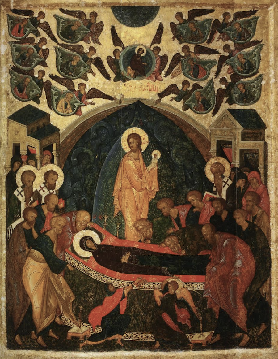 (Русский классический иконостас - „ Успение “, Андрей Рублев с учениками, 1497 година, Иконостас из Успенского собора Кирилло-Белозерского монастыря)