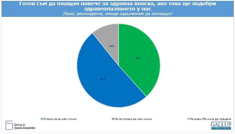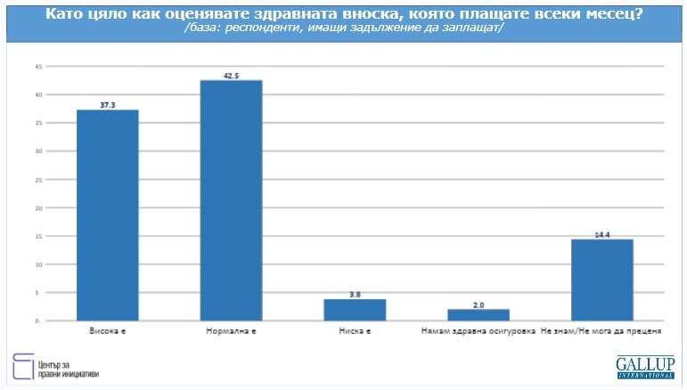 Над 70% от запитаните знаят какъв е размерът на здравната вноска, който заплащат, 20,2% не знаят, а 8,3% не могат да отговорят. Според 42,5% от участниците в проучването размерът на здравната вноска е естествена, 37,3% дават отговор, че размерът ѝ е висок, а 3,8% показват, че е невисок. 2% от запитаните показват, че не заплащат здравна вноска. Половината от участниците не показват подготвеност да заплащат повече за здраве, даже и това да усъвършенства опазването на здравето в страната, демонстрира още проучването.