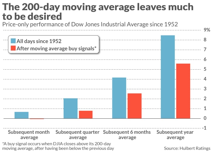 Бичи сигнал ли е преминаването на Dow над 200-дневната му пълзяща средна стойност?