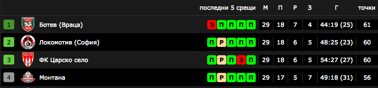 @@@Клубът на Стойне Манолов е в най-неизгодна позиция, защото би трябвало да завоюва и да чака два тима да сбъркат, с цел да получи право на историческа директна промоция, само че това не е невероятно. Отборът на Царско село изостава по още един индикатор на съперниците си, като няма нито една победа против първите два отбора в класирането, от водача позволи две загуби, а Локомотив смъкна " розовите " от първото място преди две седмици, до момента в който на " Надежда " срещата приключи без победител.