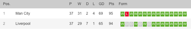 И по този начин, 274 дни след началото на сезона: първенецът ще стане явен. Нито манчестърци, нито ливърпулци не са губили точки от 3-ти март насам, а за последно водачеството е било променено във финалния ден през далечната 1989 година, когато Арсенал задмина Ливърпул, с цел да се поздрави с купата.