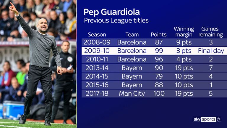 Последните четири трофеи на тимове, водени от Джосеп Гуардиола, са извоювани с разлика от най-малко 10 точки. Само в един от седемте му шампионски сезона първото място е било решено в последния кръг. През 2009/10 неговият Барселона водеше с един пункт на Реал Мадрид преди последните срещи. Каталунците победиха вкъщи Валядолид с 4:0, до момента в който мадридчани стигнаха единствено до реми като посетител на Малага.