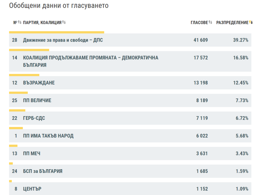 ГЕРБ – Съюз на демократичните сили получават – 10,4%, а Има Такъв Народ 7,8%, МЕЧ са с 5%, Движение за права и свободи с 4,2% и Българска социалистическа партия – 2,4%.