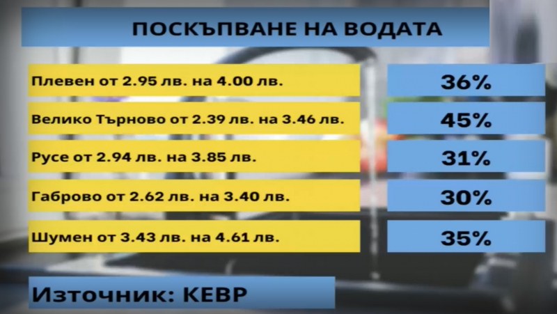 Драстичен скок на цената на водата се чака в четири града в страната - Велико Търново, Габрово, Плевен и Русе. Рекордно е настояването за нарастването във Велико Търново - 45%. Така водата от 2,38 лв. за кубик ще стане 3,46.