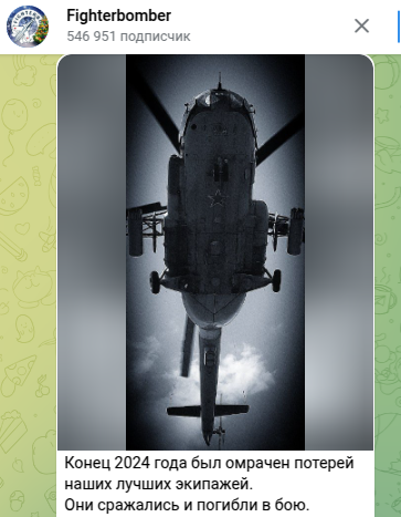 Междувременно някогашен боен водач, изтребител-бомбардировач, блогър, прочут под прякора Fighterbomber, разгласи гибелта на „ най-хубавите екипажи “ в края на 2024 година Съобщението му се появи в канала Telegram в първия ден на новата година - т.е. навръх идващия ден след вражеската офанзива против Крим.