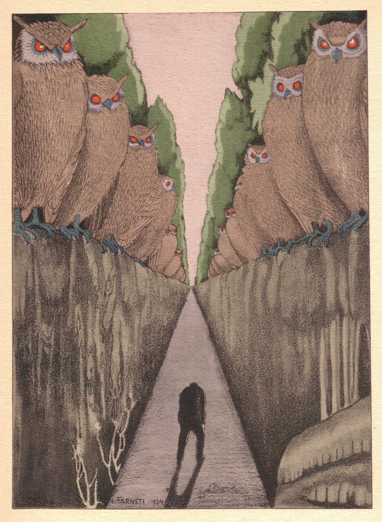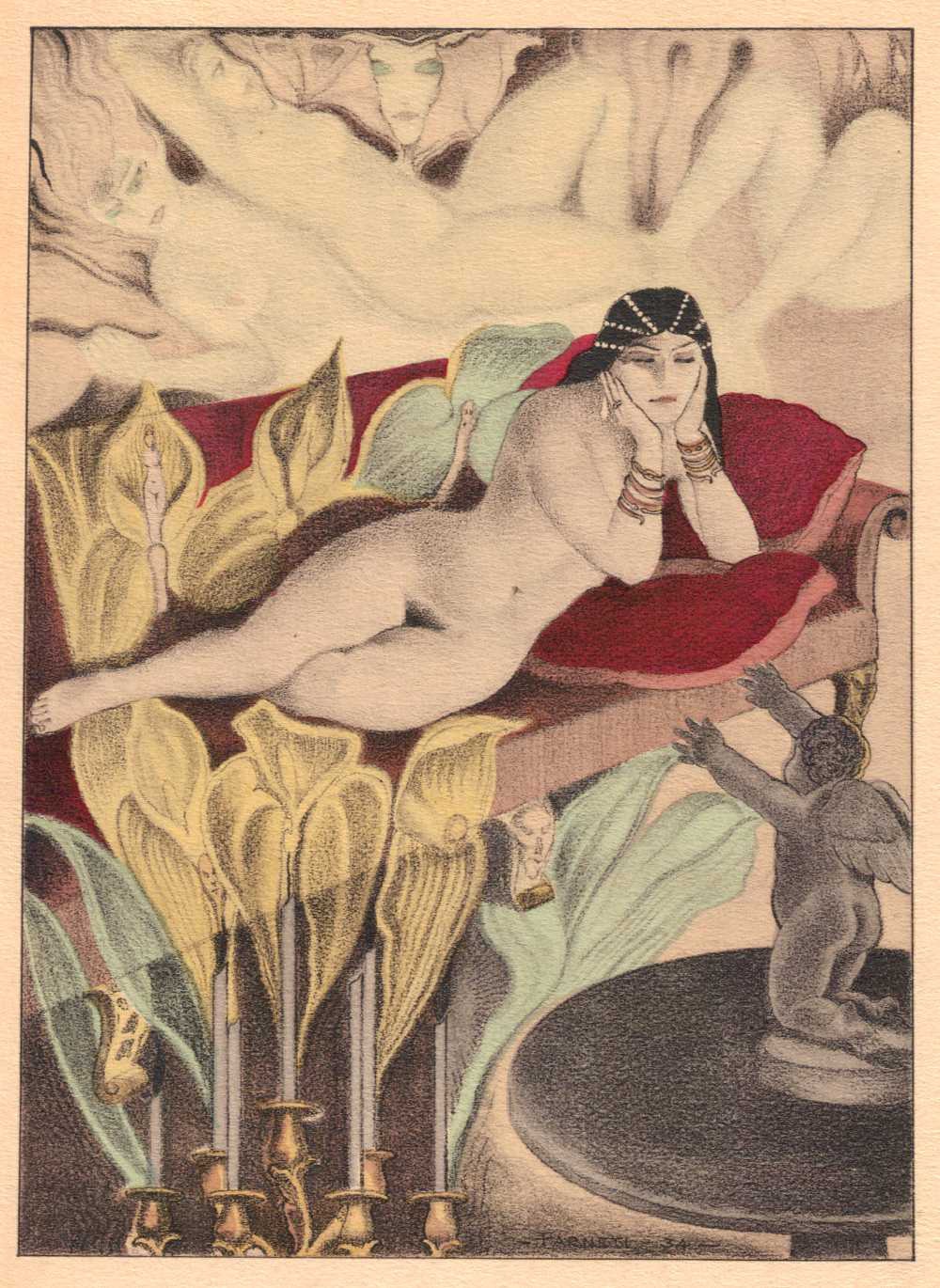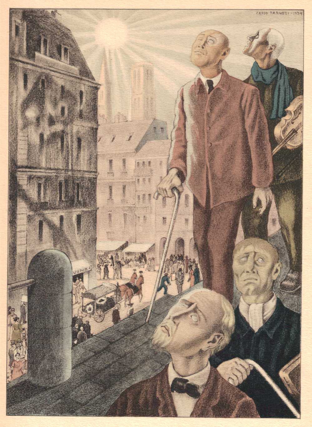 В Париж Фарнети сътворява илюстрациите към романа на Емил Зола „ Земя ”, 105 истински рисунки към библиографския разказ на Луи Фердинан Селин „ Пътешествия до края на нощта ”. Сред последните и най-значими творби на Карло Фарнети в жанра на книжната графика, са илюстрациите към изданието от 1935 година на „ Цветя на злото ” на Бодлер, които ви представяме.