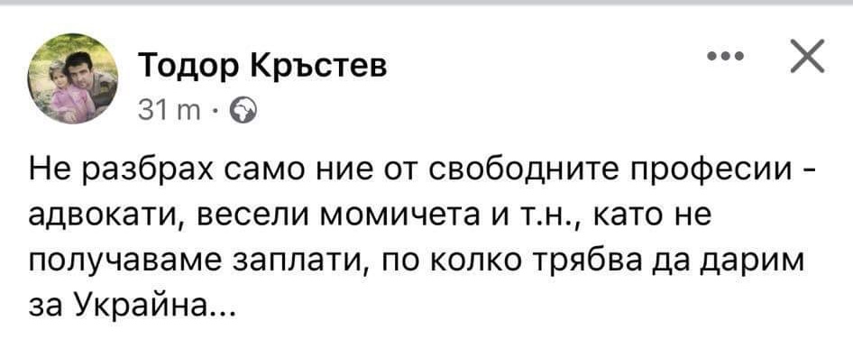 Затова откривам обществена акция за набиране на финансов запас, който да бъде възложен на украинското държавно управление. Призовавам всеки български жител, който в действителност желае да помогне на Украйна, да подари като мен една заплата. Думите са лесни, делата са сложни, време е Facebook постовете да се трансфорат в средства за Украйна.