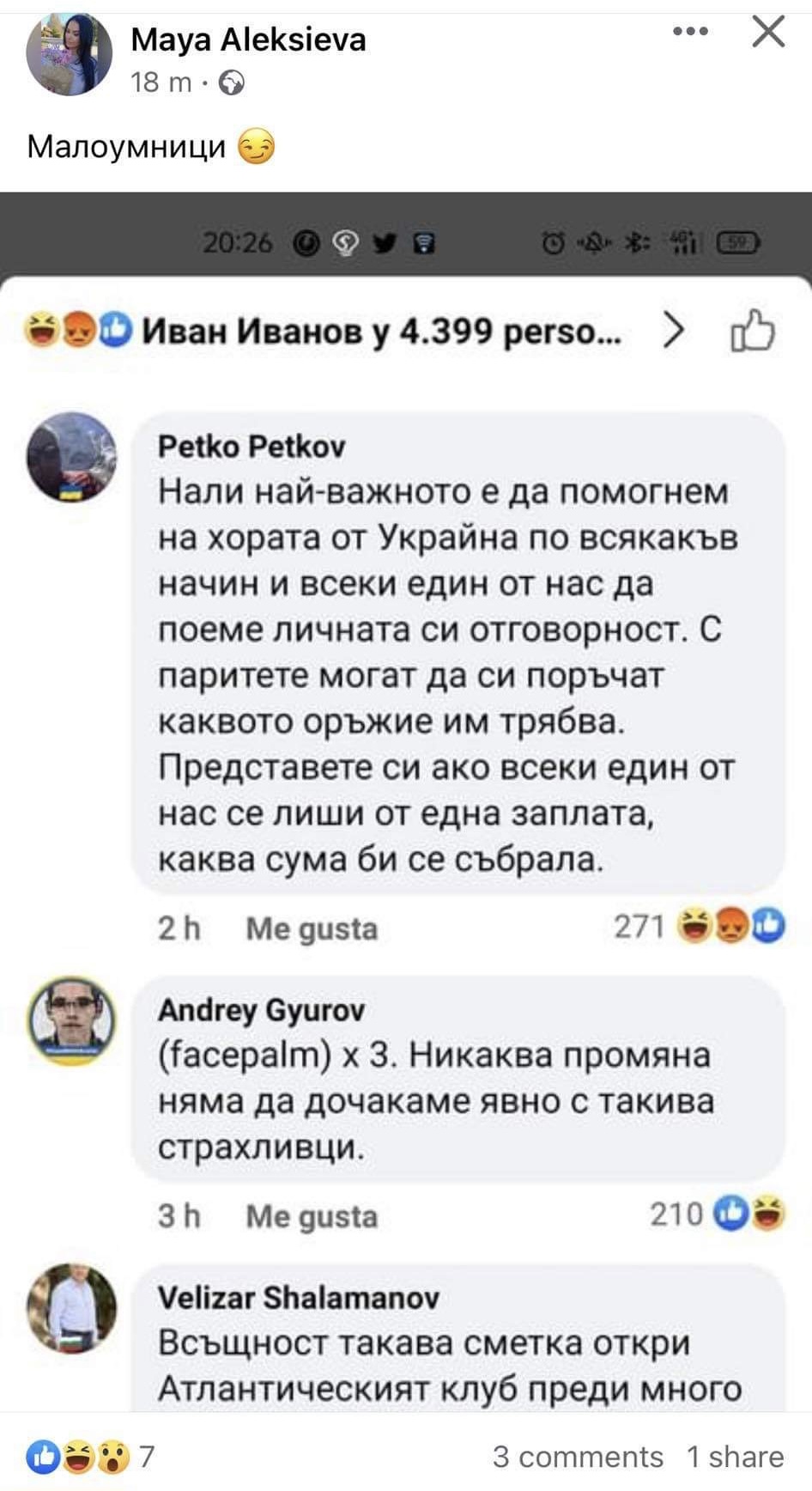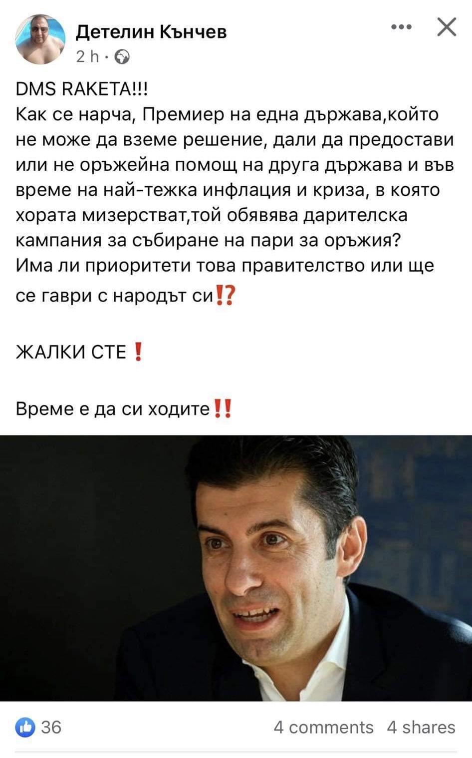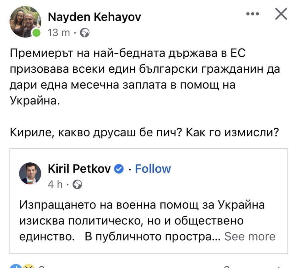 “Призовавам всеки български жител, който в действителност желае да помогне на Украйна, да подари като мен една заплата. Думите са лесни, делата са сложни, време е Facebook постовете да се трансфорат в средства за Украйна.”, съобщи Петков, като добави, че той първи ще подари една заплата на украинците. Шегите не закъсняха.