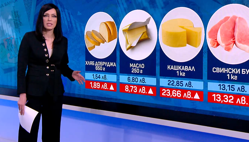 Цената на хляба да вземем за пример е нараснала с 35 стотинки – от един лев и 54 стотинки до един лев и 89 стотинки. Маслото от 250 грама се е нараснало приблизително от 6 лв. и 80 стотинки на 8 лв. и 73 стотинки, а кашкавала от 22 лв. и 85 стотинки за кг до 23 лв. и 66 стотинки.