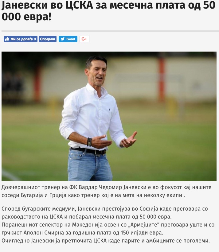 Два клуба се борят за подписа на досегашния треньор на Вардар Чедомир Яневски. Това са българският ЦСКА-София и гръцкият Аполон (Смирна). Твърдението е на изданието sitel.com.mk., което излиза със заглавие: “Яневски в ЦСКА за месечна заплата от 50 000 евро!”