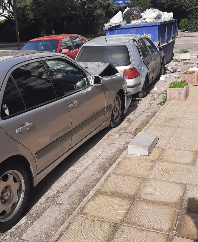 Два леки автомобила са безмилостно блъснати във Варна. Колите с марките „ Фолксваген Голф “ и „ Мерцедес “ са били паркирани на улица, компактно до тротоара, а пред тях има оставен резервоар за строителни боклуци.