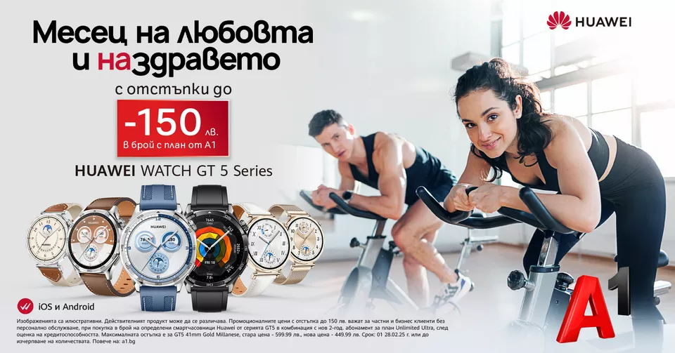 Всички модели Huawei Watch GT5 се оферират с до 150 лева отстъпка през февруари от А1