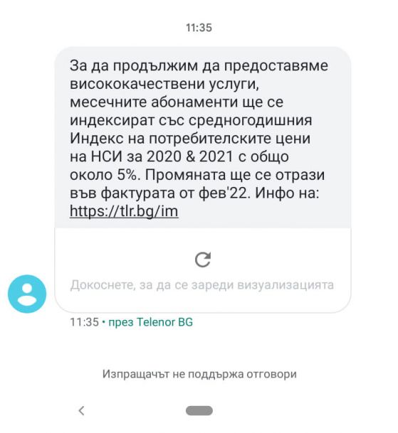 " За да продължим да предоставяме висококачествени услуги, месечните абонаменти ще се индексират със средногодишния Индекс на потребителските цени на Национален статистически институт за 2020 & 2021 с общо към 5%. Промяната ще се отрази във фактурата от фев`22 ", гласи известието на " Теленор ".
