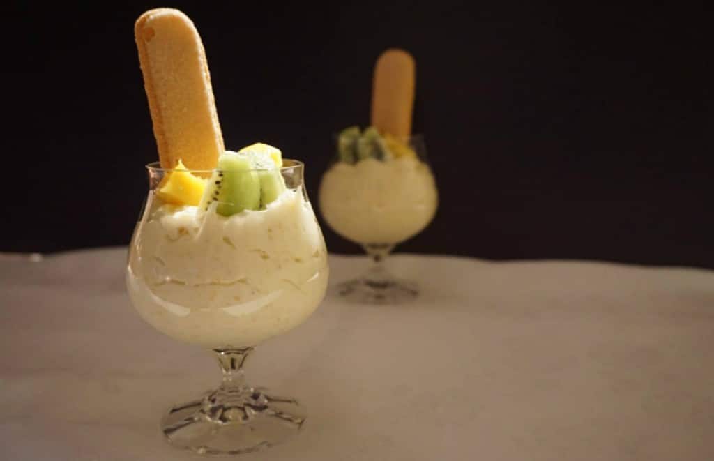Разбийте маскарпонето и кондензираното мляко до приемането на равен крем. Добавете сметаната, като разбърквате с лъжица. Десертът се разпределя в чаши и се посипва с нарязаните плодове.
