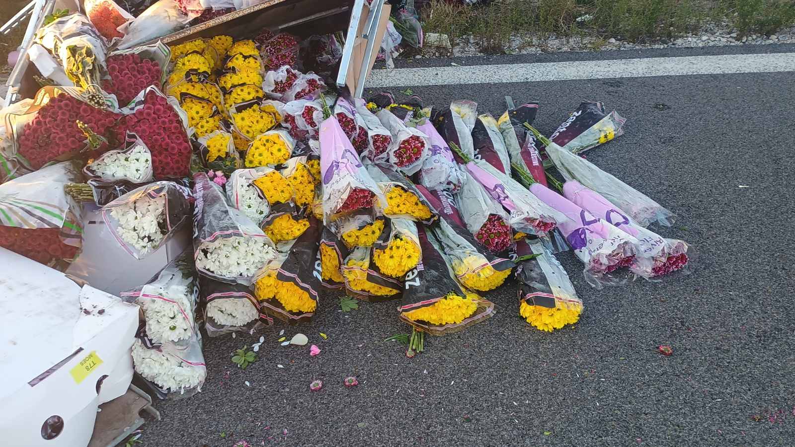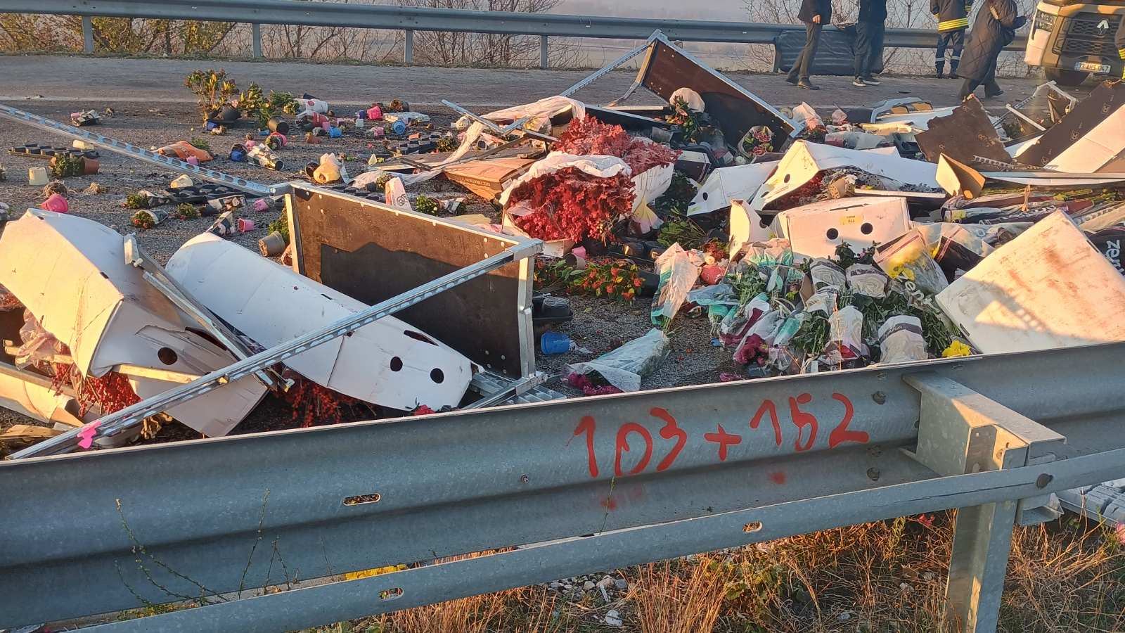 Единият камион е превозвал цветя и товарът му е разсипан по пътното платно. Предстои хилядите разпилени букети да бъдат почистени и придвижването да бъде възобновено.